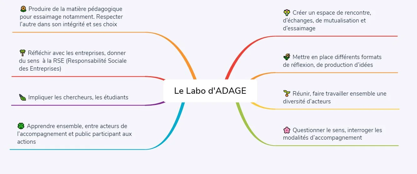 Le Labo d’ADAGE souhaite faciliter les liens entre tous types d’acteurs.actrices - dont les personnes accompagnées - pour partager méthodes, outils, analyses et notamment celles des mutations socio-économiques. Notre objectif est de mutualiser, essaimer, produire des études, questionnements et préconisations et ainsi contribuer à retrouver du sens. Les femmes suivies dans nos dispositifs sont considérées comme des expertes des processus d’accompagnement.